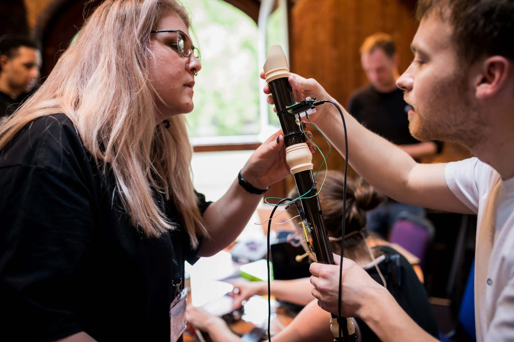 Liza Bec, SIE’s team representative from Paraorchestra, has a very rare form of epilepsy that is triggered by specific movements involved in playing instruments at a professional level. Specifically, performing arpeggios and crossing hands are two performance elements that can be trouble spots for Liza. Thus, they created the Robo-recorder, a custom-built, electronically enhanced musical instrument, and the members of the SIE team were paired with Liza to expand on the device’s capabilities: