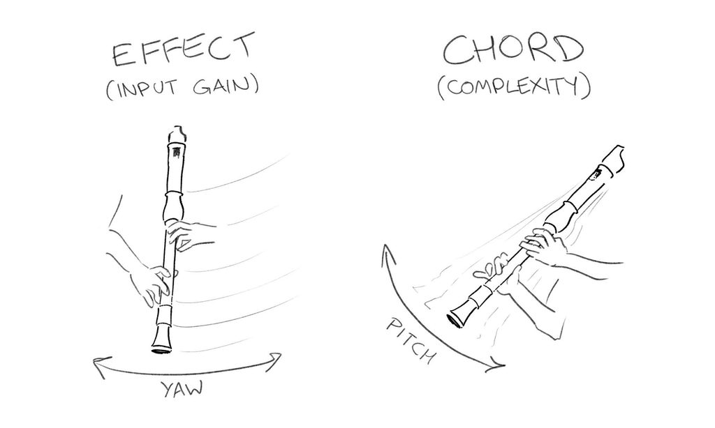 By measuring the recorder’s movement left-to-right, specific effects like echo or reverb would be added; their intensity controlled by the speed of the movement. Through measurement of the tilt angle of the recorder, the harmonic complexity of chords would be changed. For example, the higher the recorder is lifted, the more notes will be introduced into the chord.